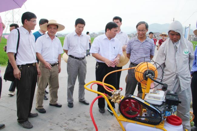 在現(xiàn)場(chǎng)活動(dòng)中.農(nóng)業(yè)廳廳長(zhǎng)張明沛、玉林市副市長(zhǎng)鄧長(zhǎng)球等領(lǐng)導(dǎo)向湖南豐茂植保機(jī)械有限公司負(fù)責(zé)人和植保技術(shù)人員詢問了新型藥械性能、使用效果和統(tǒng)防統(tǒng)治情況。張廳長(zhǎng)說,專業(yè)化統(tǒng)防統(tǒng)治是解決一家一戶農(nóng)民防病治蟲難、提高防治效果、減少農(nóng)藥污染的有效途徑,有益于促進(jìn)糧食穩(wěn)定增產(chǎn)、保障農(nóng)產(chǎn)品質(zhì)量安全和農(nóng)業(yè)生態(tài)環(huán)境安全;各級(jí)農(nóng)業(yè)部門要進(jìn)一步加大力度,推進(jìn)專業(yè)化統(tǒng)防統(tǒng)治工作又好又快發(fā)展,加強(qiáng)示范帶動(dòng),擴(kuò)大專業(yè)化統(tǒng)防統(tǒng)治覆蓋面。